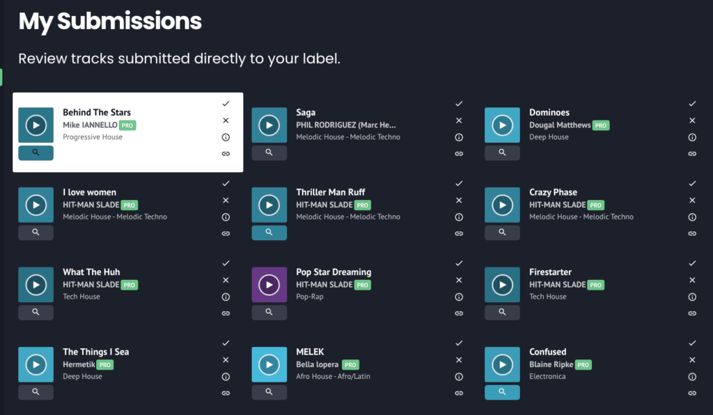 Labels can organize incoming demos by genre, country, and trending status, preview 20-second clips, shortlist tracks, start chats with artists, and confirm signed deals inside the platform. Artists can submit directly to individual labels or use one-to-many submissions, which place a track in the General Submissions pool for 60 days and widen the number of labels that can hear it.